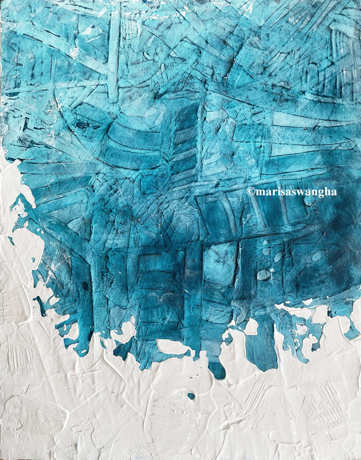 A Meeting And A Clash abstract painting, accelerated climate change, Black Canadian artist, blue and white painting, delayed winter, ice loss, marisa swangha, northern waterscape, seascape, seasonal alteration, textured details